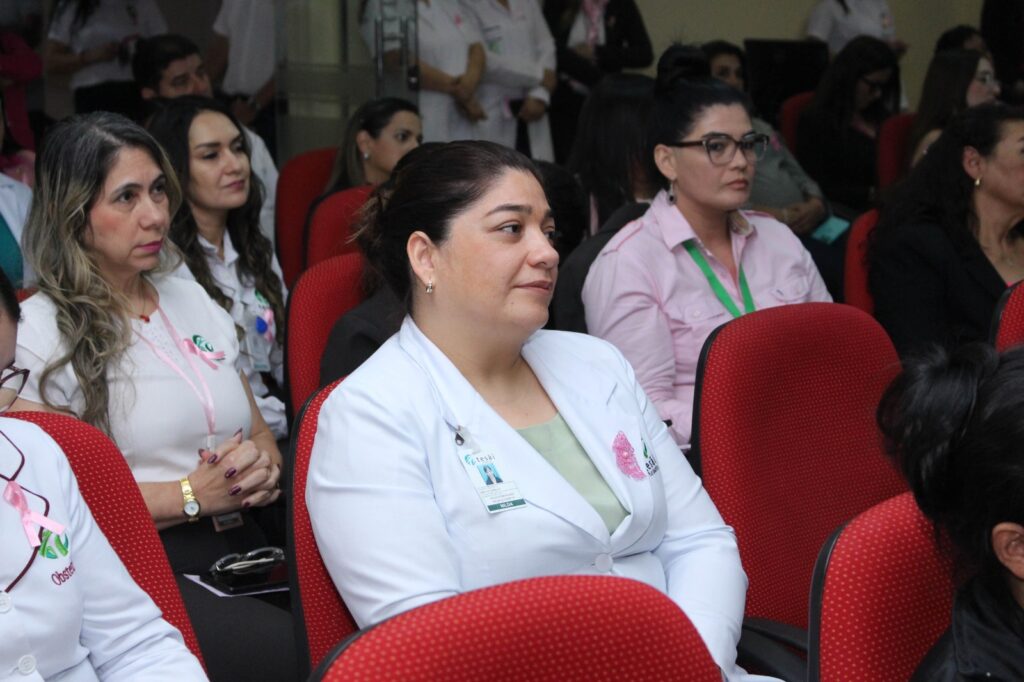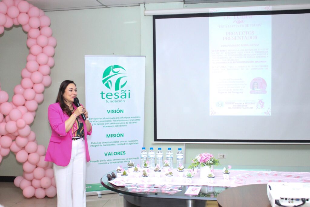 Hicieron uso de palabra la Lic. Gricelda Escobar, gerente administrativa de la Fundación Tesãi, la Dra. Norma Tandé, jefa del Servicio de Imágenes del Hospital del Área 2, además de un emotivo testimonio de vida brindado por una paciente que superó la etapa crítica del cáncer de mama, la Sra. Graciela Ortega de Acosta y la Dra. Kathia Ayala, directora del Hospital Regional de Ciudad del Este e integrante del equipo de profesionales en mastología de la Fundación Tesãi.